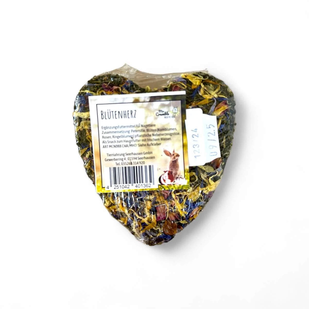 Dieses niedliche Blütenherz ist ein ganz besonderes Leckerli: Eine Kombination aus Petersilie und einer bunten Blütenmischung sorgt für langanhaltende Beschäftigung und natürlichen Knabberspaß für Meerschweinchen, Hamster, Zwergkaninchen und andere Nager.