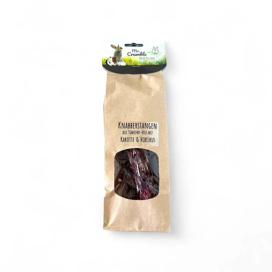 Natürlicher Knabbergenuss für eure Meerschweinchen, Hamster oder Zwergkaninchen: Timothy-Heu ist ein ganz besonderes Heu aus hochwertigem Süßgras und eignet sich dank seines niedrigen Zuckergehalts auch ideal für empfindliche Tiere. Feinster Hibiskus und Karotte runden den Leckerbissen ab. Zusammengehalten werden die Stangen ausschließlich durch natürliches Leinmehl, das die Fellgesundheit eures Nagers unterstützen kann.
